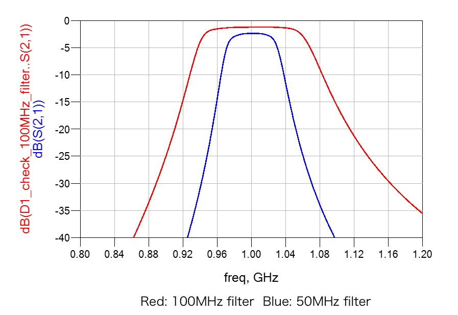 In the above case, if we increase the Quality factor of the resonator used in the 50MHz filter, we can achieve the same insertion loss as the 100MHz filter. This higher Q can be obtained by using larger resonators, such as 6 mm or 12 mm types.