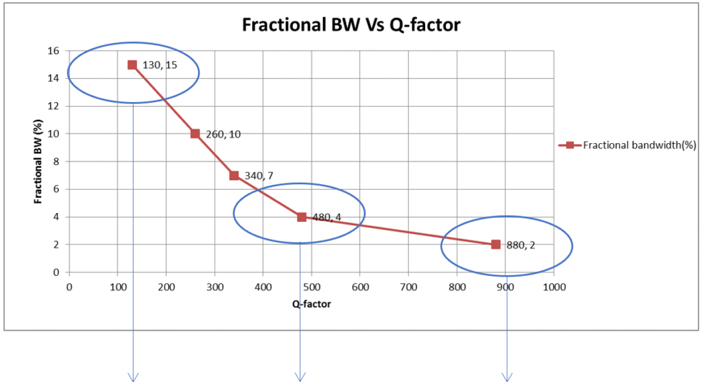 The fractional bandwidth plays a key role in determining the insertion loss of the filter. Consider two example filters, both with a center frequency of 1000 MHz. If one has a 50 MHz bandwidth, its fractional bandwidth is 5%. If another has a 100 MHz bandwidth, its fractional bandwidth will be 10%. In both cases, let us assume both filters use a 4th order design with the same ceramic resonator type — for instance, a 4 mm resonator with a quality factor of around 350. Let us assume both the filters are of 4th order and use the same type of ceramic resonator, say 4mm. The quality factor of individual resonators would be around 350.
