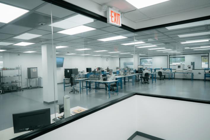 A 3,500-square-foot class 100k cleanroom environment occupies the center of the space, enclosed behind quarter-inch glass walls. Members enter the cleanroom through an airlock and must be outfitted with full-length ESD-safe lab coats, gloves and protective head- and foot-coverings to prevent contamination with dust or other foreign objects. The HVAC system is designed with a special air handler and filter to eliminate contaminants from the air in the controlled area – not easy equipment to come by amidst the pandemic when demand for air filtration exploded, says Keri.