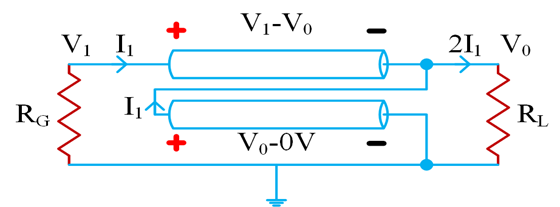A basic transmission line transformer consists of a two-conductor transmission line. The first conductor is connected from the generator to the load, and the other conductor is connected at the output of the first transmission line and the load to ground, as seen in Figure 6. With this configuration, the current flowing through the load is twice the current flowing through the generator, and V0 is one half the voltage V1. Hence, the load resistance is only a quarter of the resistance seen at the generator side, yielding a 1:4 transformer (Equation 2).