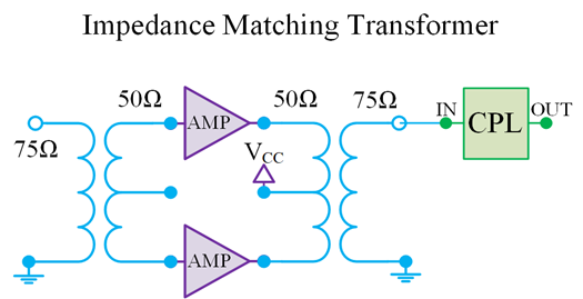 Figure 10: A 50Ω balanced amplifier that uses transformers to match impedance to 75Ω