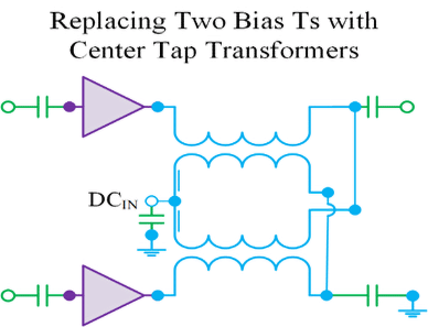Moreover, if a DC current is required for a subsection of a circuit, a specialized RF transformer can be used to inject DC current into the signal path. For example, two center tapped transformers can be used to inject a DC bias, replacing the need for two Bias Ts (see Figure 11).