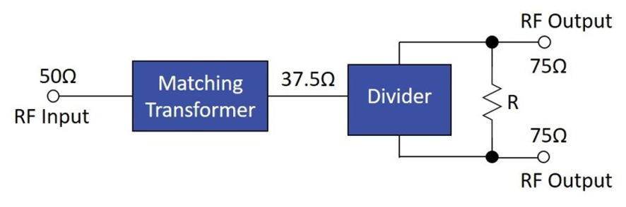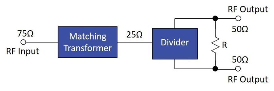 Traditionally, power dividers/combiners are invaluable passive components that allow transmitters and receivers to combine or divide signals as necessary. Component availability for characteristic impedance of 50Ω is ample. A mixed impedance splitter (50Ω at input and 75Ω at output, or 75Ω at input and 50Ω at output) can help in certain signal processing applications, such as realization of 75Ω balanced amplifiers.