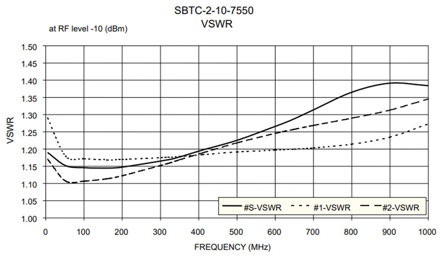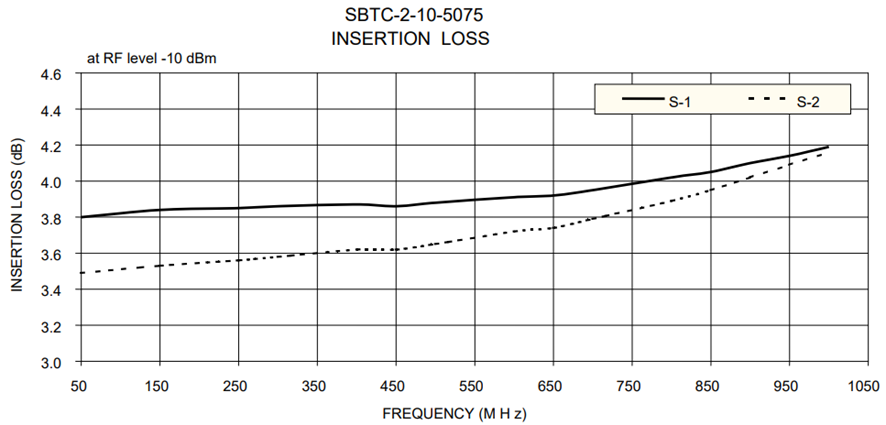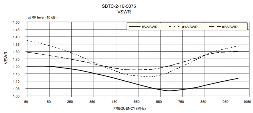 Model SBTC-2-10-5075+ is a 2-way splitter from 50Ω input to 75Ω output. It shows about 1 dB insertion loss up to 860 MHz and 1.2 dB at 1000 MHz (above the 3 dB split); see Figure 3. Also, it has excellent VSWR (voltage standing wave ratio) as shown in Figure 4: 1.05 – 1.20 (typ.) at the input (port S) and 1.15 – 1.35 (typ.) at the outputs (ports 1 and 2) from 50 to 1000 MHz. The specifications are given in Table 1.