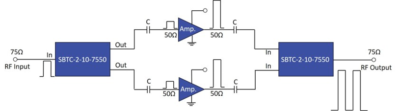 Usually, a cable system operates at 75Ω impedance. But, most RF amplifiers have a 50Ω impedance. By using the circuit shown below in Figure 7, amplification of RF signals in a 75Ω system is possible using 50Ω amplifiers. With impedances matched in the circuit, maximum power will be transferred and the system designer has a wider choice of amplifiers.
