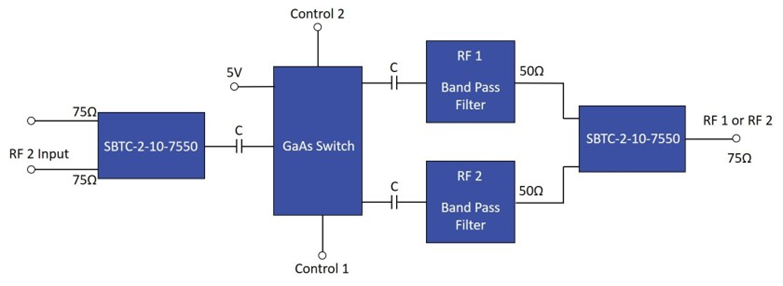Many RF communication systems are using a cable network now, and therefore require wide-band 75Ω RF switches. RF communication systems have traditionally been implemented in 50Ω impedance; there, for matching, switches are generally designed for 50Ω. A pair of power splitters with 50Ω input and 75Ω output will enable a 50Ω switch to be used in a 75Ω cable network. Figure 8 shows a circuit for selection of cable signals that can be used for network connection.